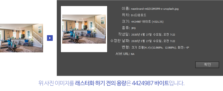 일러스트 작업을 하면서 용량에 가장 큰 영향을 주는 요소 중 하나가 바로 사진용량입니다. 보통 풀 슬라이드나 메인 이미지의 경우에는 고화질의 사진을 사용하는 경우가 많은데, 고화질의 사진 자체의 용량도 상당해서 그대로 연결하여 삽입해서 사용하는 것 보다는 래스터화를 시키는 것이 훨씬 용량을 줄일 수 있는 방법입니다.