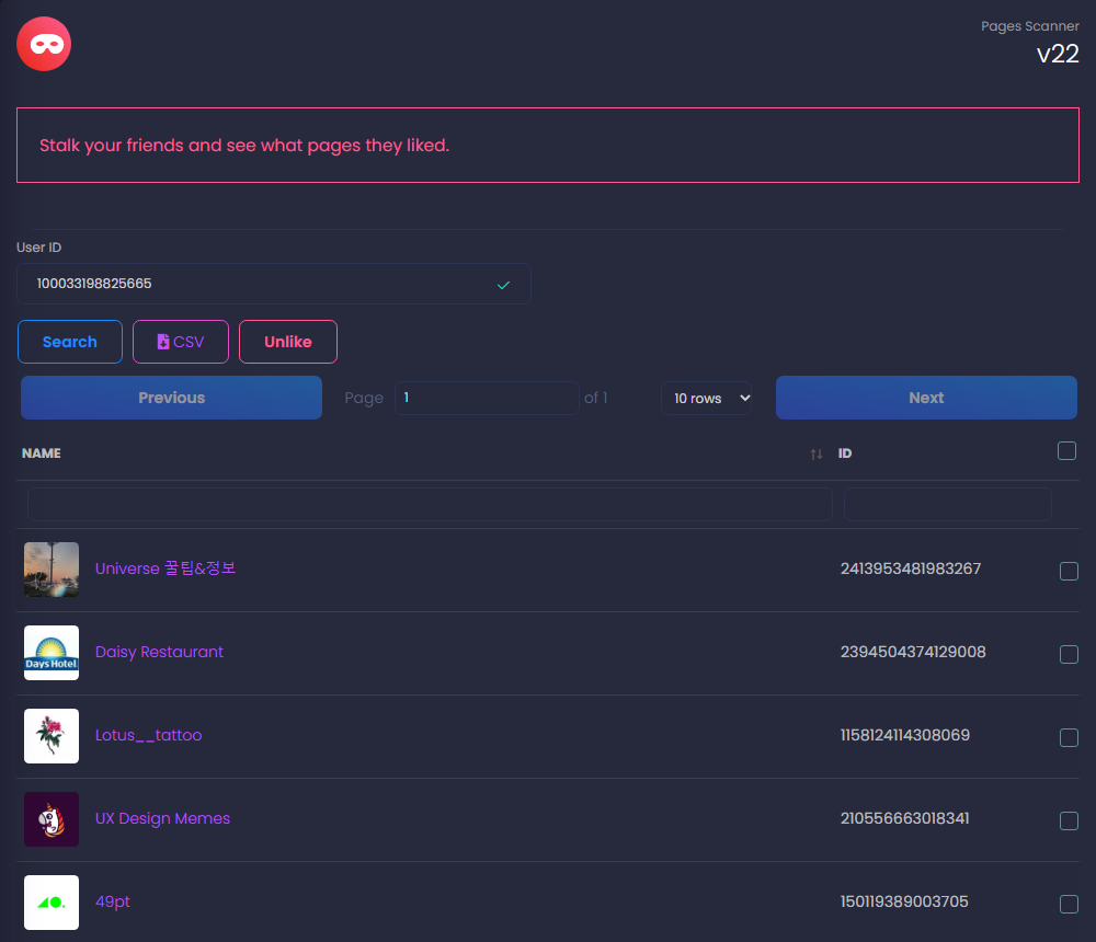 그다음 rows(열)를 All rows로 변경해주고 우측의 체크박스를 클릭하면 모든 페이지가 선택됩니다. 다음, Unlike 버튼을 누르면 내가 좋아요 했던 페이스북 페이지를 모두 페이지 좋아요 취소할 수 있습니다. 다만, 삭제된 페이스북 페이지 등은 취소되지 않습니다. DB로만 존재하게 됩니다.