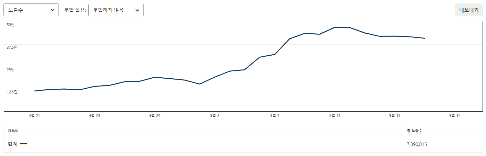 최근에 도입된 핀터레스트의 신규 분석 툴이다. 아직 어떻게 보면 좋을지 감이 잡히진 않지만 위의 그래프 옵션에서는 노출수를 기준으로 요일별로 확인할 수 있다. 4월 21일부터 시작해서 현재까지 노출 수 그래프를 확인할 수 있다.