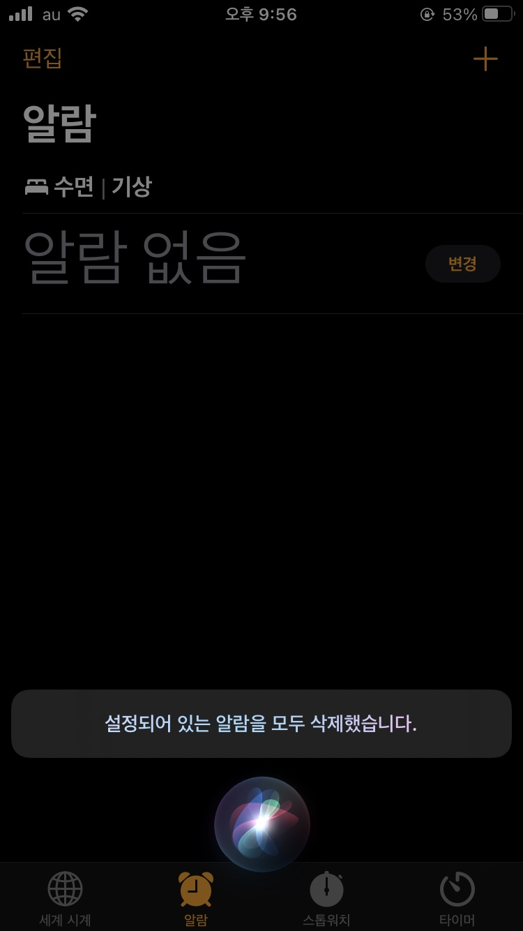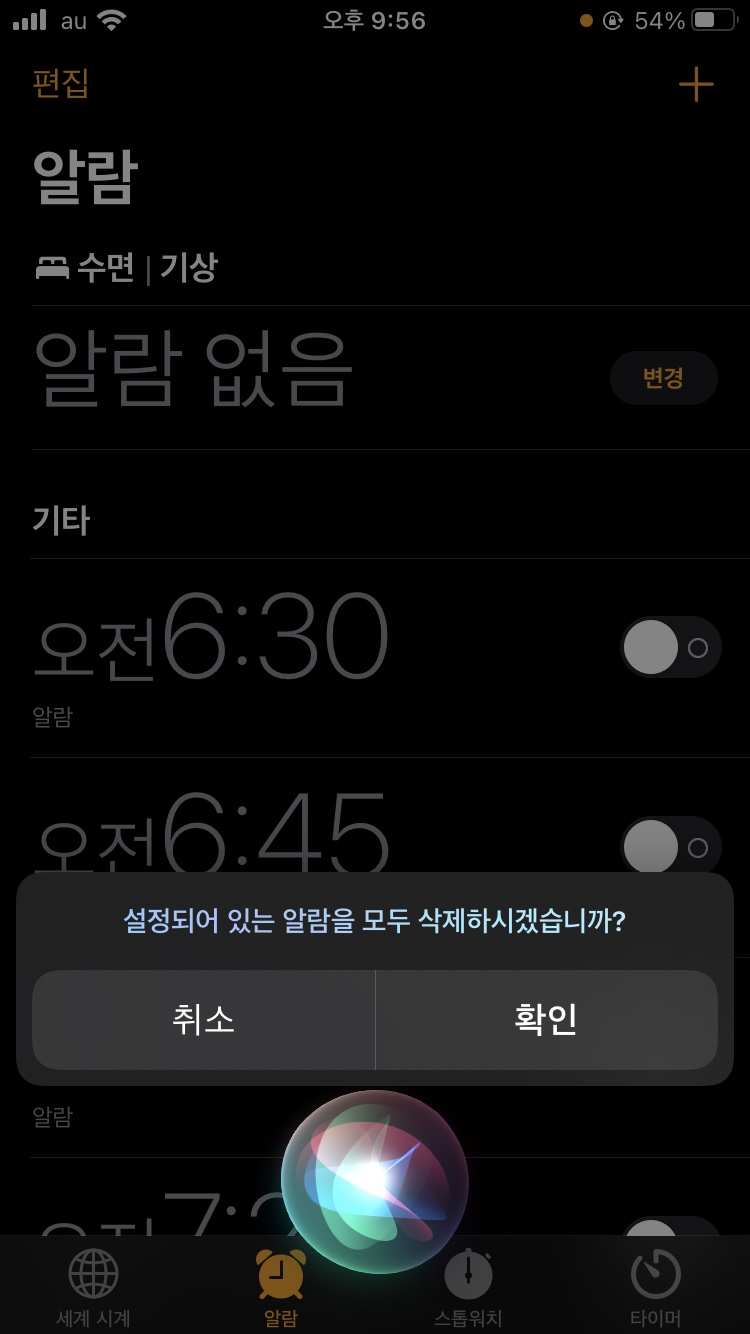 일반적으로 홈버튼을 누른 상태에서, '시리야~'라고 말하면 시리 기능을 킬 수 있습니다. 그 상태에서, "알람 모두 삭제"와 같이 시리에게 말하면 알람을 모두 삭제할 수 있습니다.