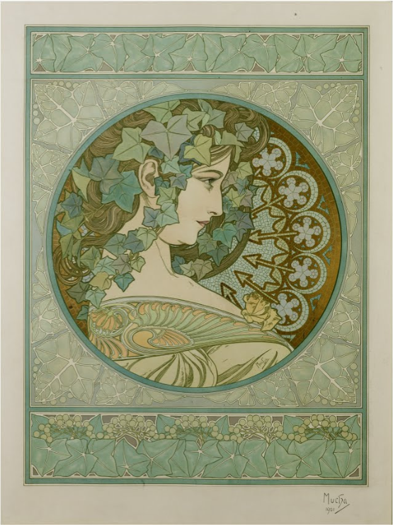 "Art Nouveau advertising poster. This panel is reminiscent of Mucha's poster designed for the dancer Lygie the same year and may have been inspired by her.