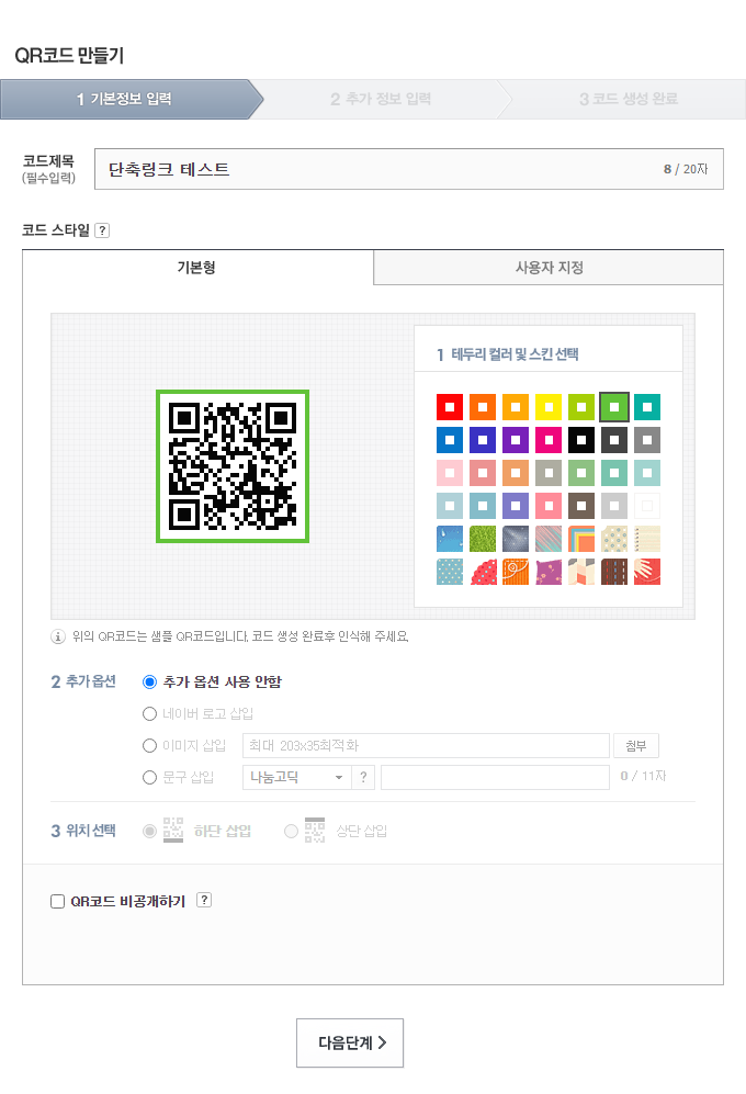 별도로 다른 것은 굳이 세팅할 필요는 없습니다. 따라서, 추가 옵션 사용 안함을 선택하고 제목만 설정한 다음, 다음 단계 버튼을 클릭합니다. 그다음에 여러 가지 설정을 할 수 있지만, 링크만 넣고 생성 버튼을 눌러도 괜찮습니다. 이렇게 QR코드를 만들면 아래와 같이 표시됩니다.