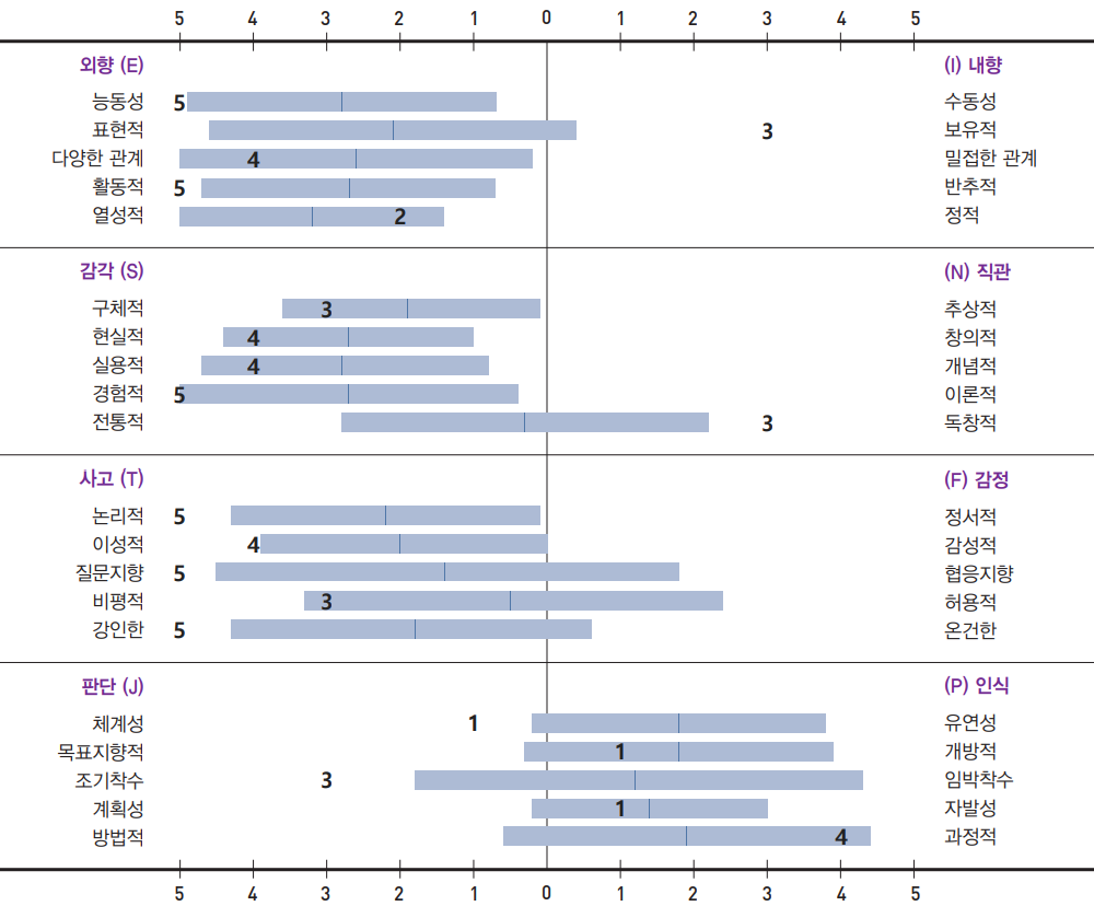 기존의 검사 결과에서는 직관 지수에 조금 더 치우쳐진 결과들은 아마 과거 혹은 기존에 생각했던 사고방식들이 드러난 것이라 판단되고 이제는 그러한 생각들과 계획들을 현실화시키는 과정에서 감각 지수가 크게 발달했을 것이라 추측한다.