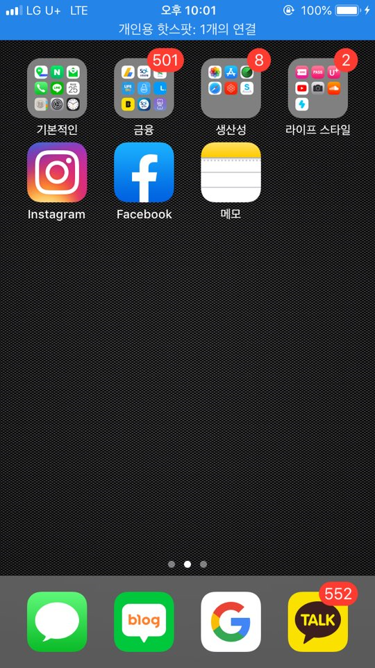 나름대로 정리한다고 정리한 제 아이폰입니다. 페이스북이나 인스타그램 업로드는 보통 컴퓨터로 하지만, 그래도 자주 확인해야하는 소식들이나 메세지들은 메인에 놓고 사용하고 있습니다. 네이버블로그는 휴대폰으로 잘 확인을 안하는데, 저게 익숙해서 저렇게 두고 있네요. 오히려 저 자리에는 라인이 들어가면 더 좋을 것 같아요. 그 외에 생활편의앱 등이 설치가 되어 있습니다.