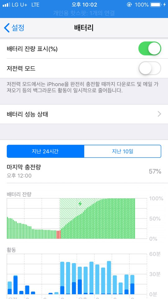 테더링을 하면서 동시에 충전도 같이 하고 있기 때문에 제 배터리 활동 통계에서는 활동량이 많은 것으로 나옵니다. 그리고 배터리 성능 상태도 확인할 수 있습니다. 몇 년을 넘게 사용한 아이폰임에도 불구하고 성능 최대치가 82% 입니다. 생각보다 휴대폰 사용량이 적어서 그렇습니다. 테더링을 하지 않을 때는 거의 휴대폰을 하지 않는 경우도 있습니다.