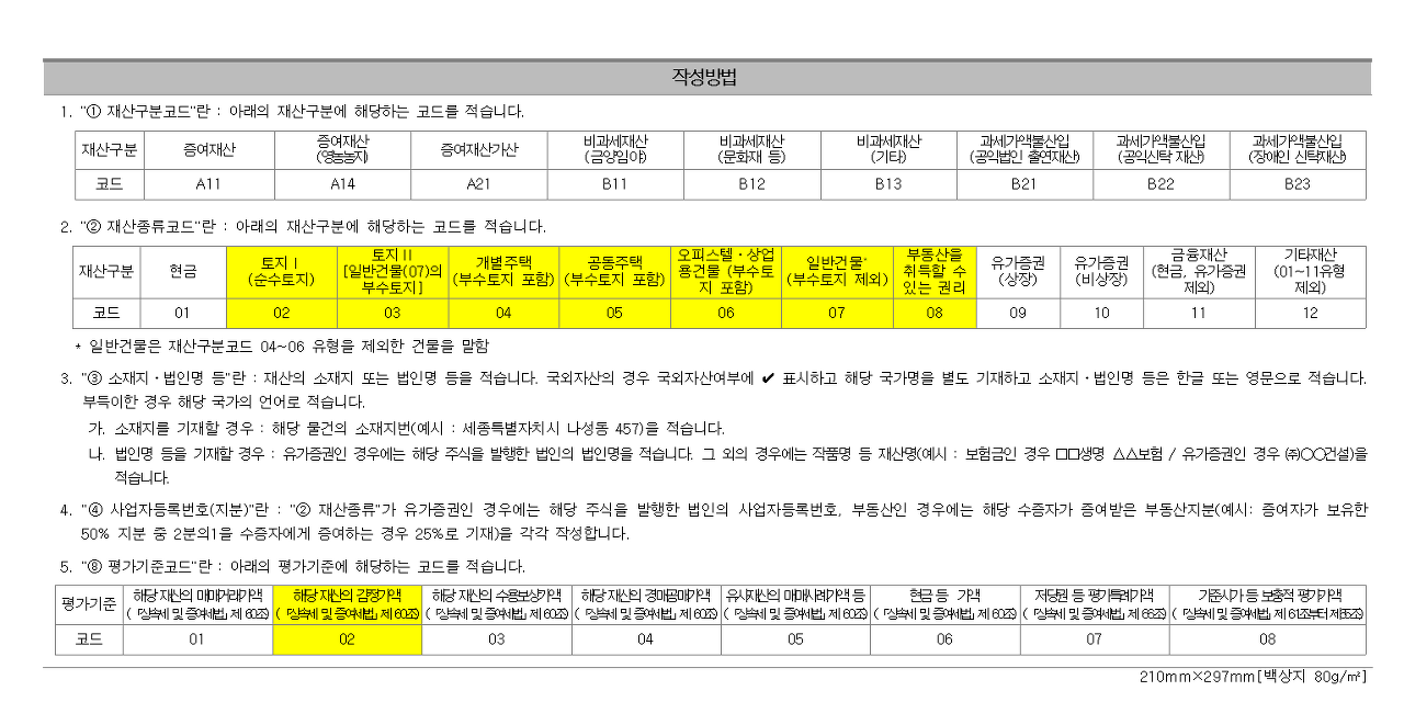 증여재산 및 평가명세서에서는 각 재산종류마다 코드가 다르므로, 해당 코드를 정확하게 기재해야 합니다. 예를 들어, 아파트, 다세대주택(공동주택)의 경우 05번, 단독주택, 다가구주택(개별주택)의 경우 04번, 토지의 경우 02번, 입주권, 분양권의 경우 08번 등을 구분해 입력해주어야 합니다.