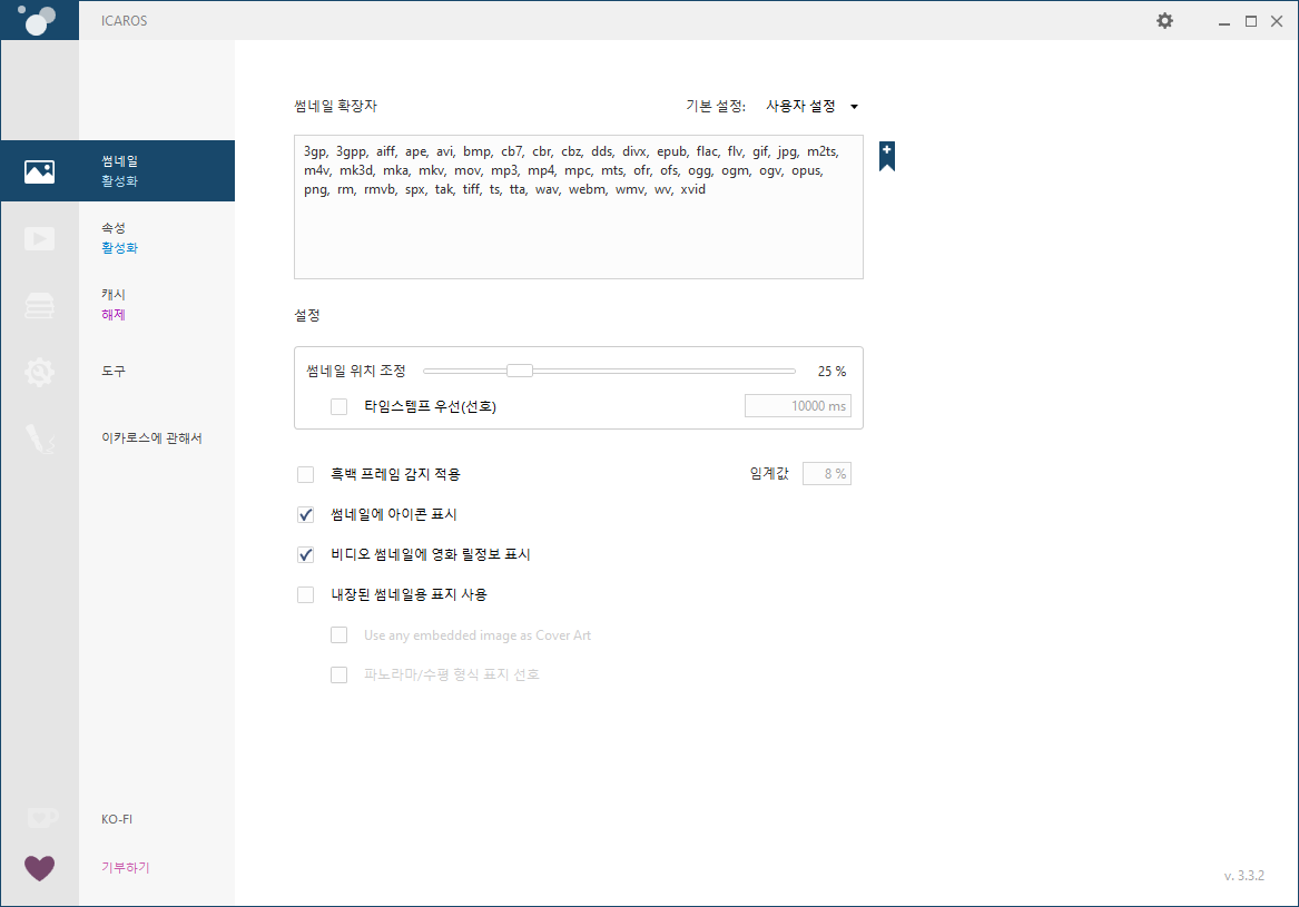 - 좌측 사이드바에서 썸네일이 비활성화된 경우, 한 번 클릭하여 활성화로 변경합니다. 또한, <썸네일에 아이콘 표시> 옵션이 체크되어 있는지 확인합니다.
