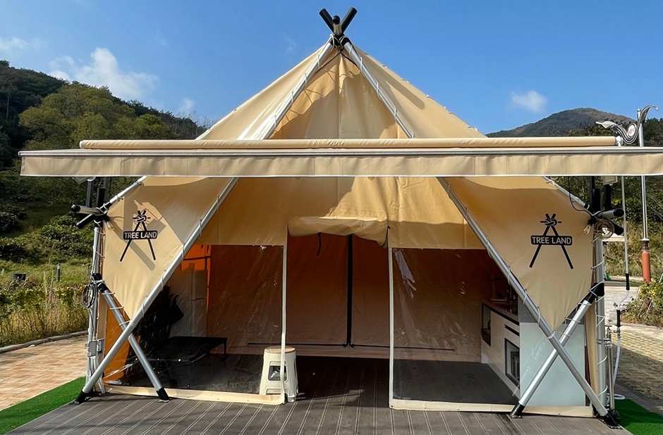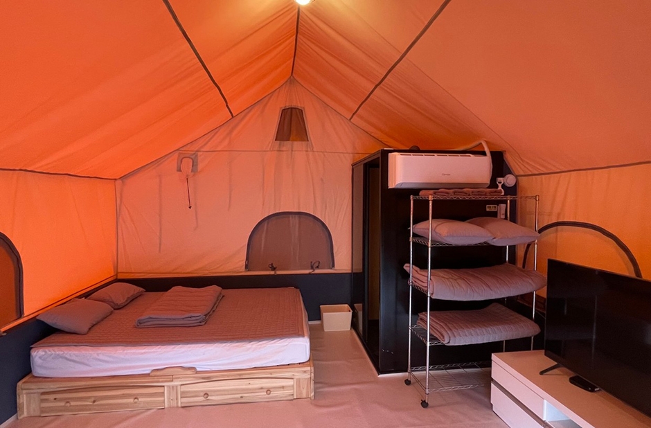 캠핑장에는 다양한 크기의 파쇄석 사이트가 30면 마련되어 있으며, 8인, 6인, 4인이 머물 수 있는 공간을 제공합니다. 글램핑 시설도 6개 동 운영 중이며, 내부에는 침대, TV, 테이블, 개수대, 취사도구, 화장실, 샤워실 등 일상생활에 필요한 시설이 갖춰져 있습니다.