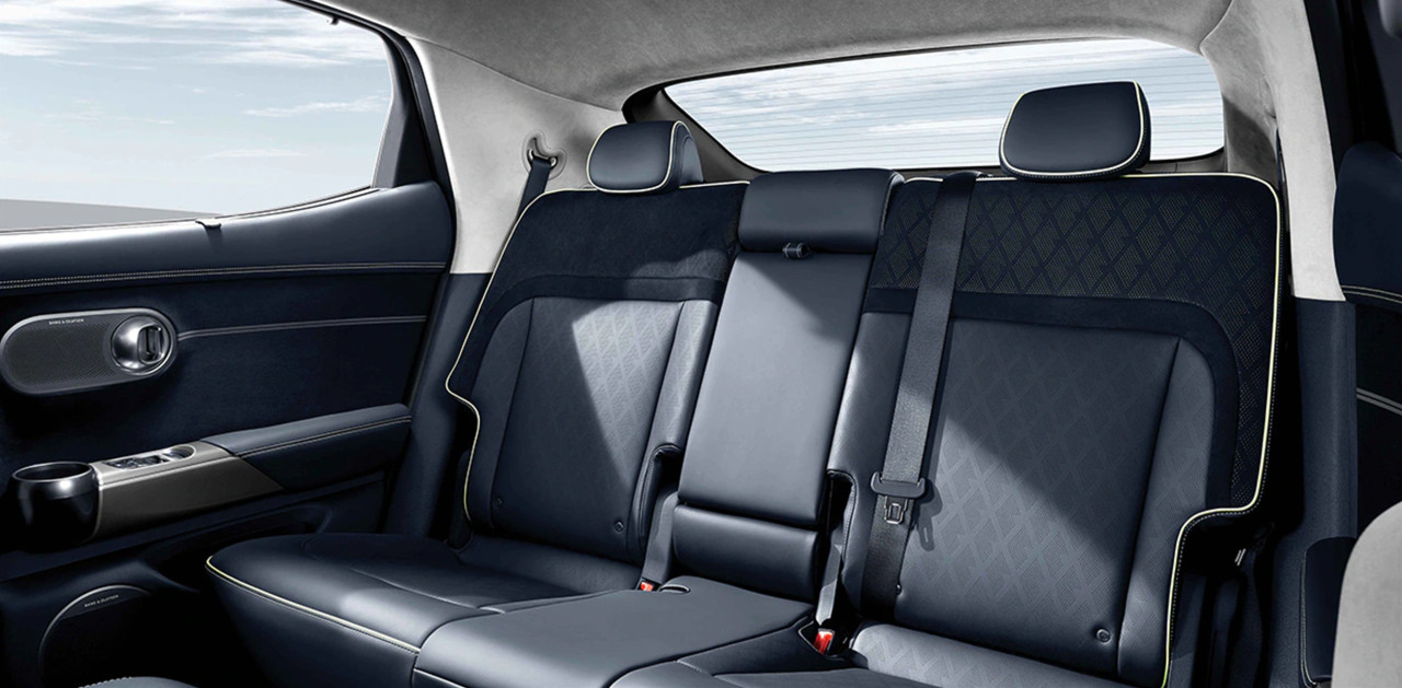 GV60의 내부는 'Beauty of White Space'라는 브랜드 철학을 반영하여 현대적이고 미니멀리스트적인 느낌을 줍니다. 고급 소재의 사용은 물론, 2024년 모델에는 새로운 친환경 패브릭 옵션도 추가되었습니다. 차량의 내부는 1열/2열 헤드룸이 각각 39.0/38.1인치, 레그룸이 42.3/37.6인치, 숄더룸이 57.5/55.9인치로 넉넉한 공간을 제공합니다. 또한, 전기차 특유의 평평한 바닥은 내부 공간의 개방감을 더욱 증대시킵니다.