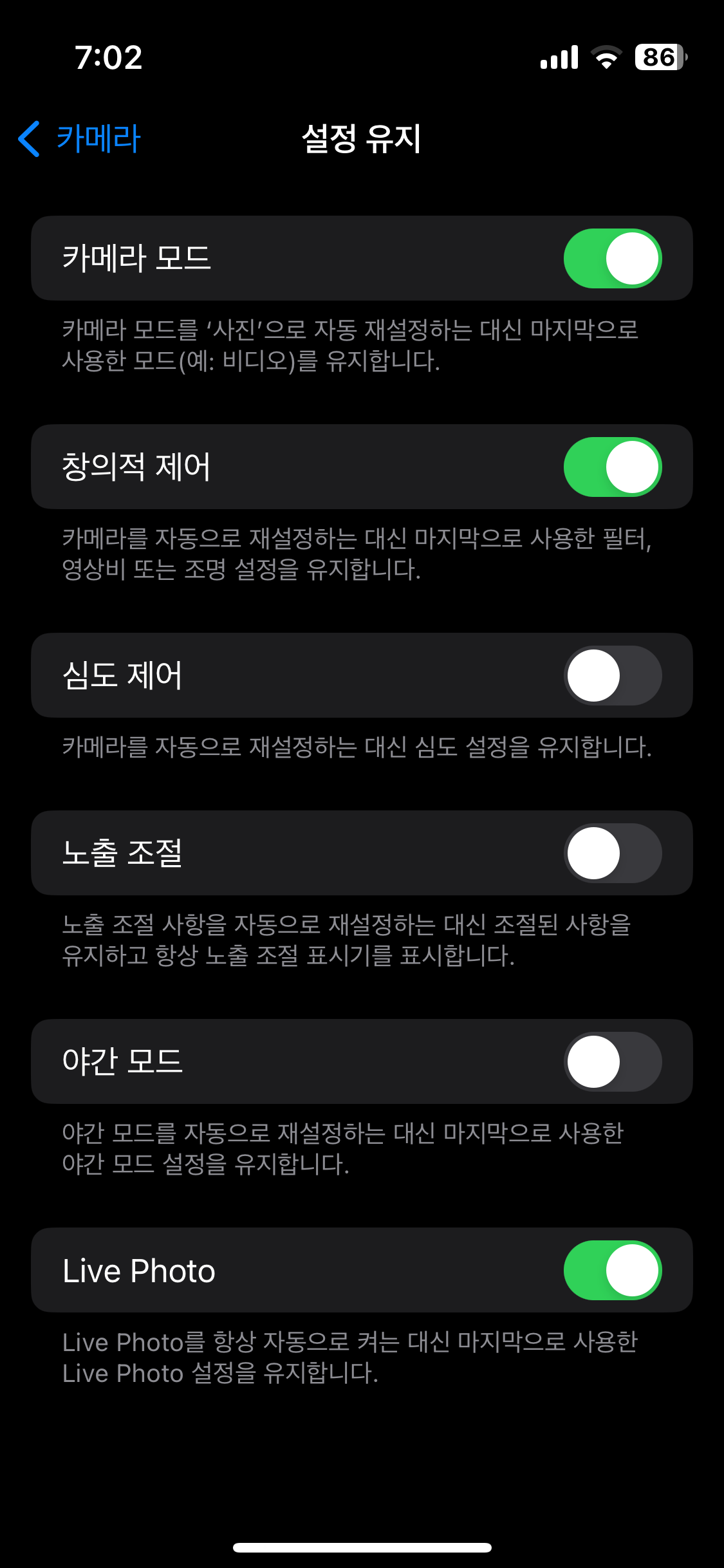 카메라 모드를 지속적으로 유지하려면 설정 유지 옵션을 켜야 합니다.