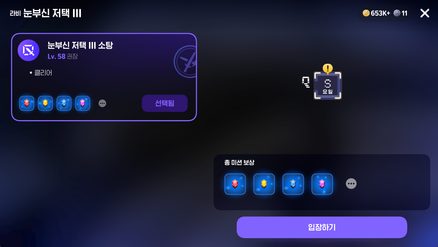 - 요일 던전은 특정 요일에만 입장 가능하며 골드, 보석, 강화 재료, 유니크 장비 등 성장에 필수적인 귀한 재화를 얻을 수 있는 핵심 콘텐츠예요.
