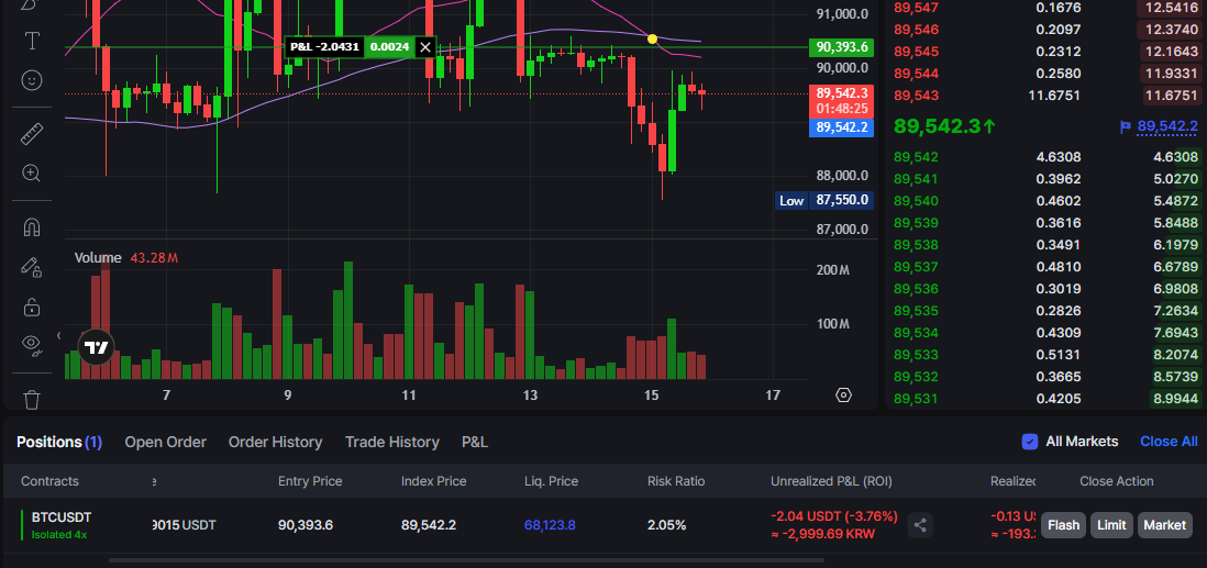 - PNL(ROE): 현재 포지션의 손익 상태를 금액(PNL)과 수익률(ROE)로 보여줍니다. 비트코인 숏 포지션은 가격이 하락할수록 수익이 증가합니다.