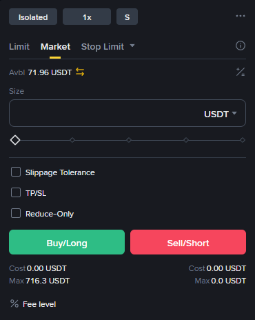 - 주문 방식 선택: 지정가(Limit) 또는 시장가(Market) 중 선택합니다. 즉시 포지션을 열고 싶다면 시장가를 선택합니다.